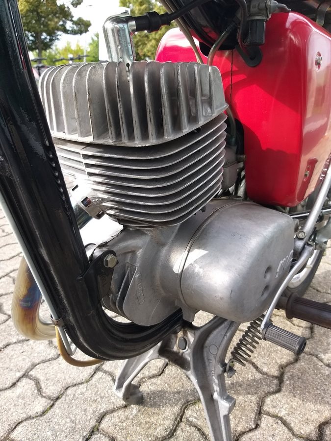 Wir verkaufen eine MZ TS150 in hervorragendem Zustand. Diese TS150 ist eine der Ersten, die nach der ES150 Baureihe gebaut worden ist. Das ist zu erkennen am hinteren Kotflügelendstück, dem Spiegel und des abschmierbaren Schwingbolzens. Dieses sind noch Serienenbestandteile der ES150. Wir haben den originalen Lack mit einem Klarlack versehen, dadurch sind kleine Kratzer sichtbar aber überlackiert und somit geschützt. Die TS150 ist auf 12V Vape umgerüstet, die Heidenaubereifung ist neu.