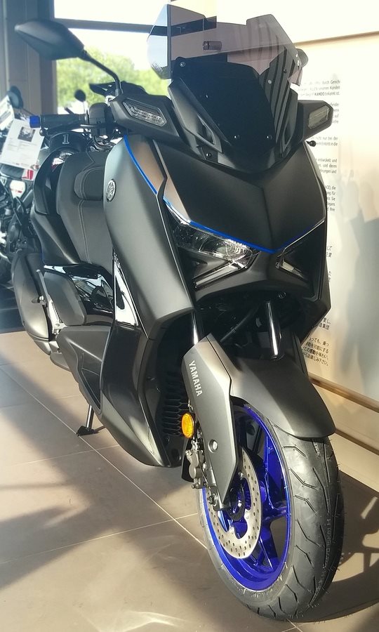 Wir haben diesen XMax auf sportliche Heidenau-Reifen gestellt, einen kurzen Kennzeichenhalter verbaut und ein schwarzes kurzes Windschild montiert.