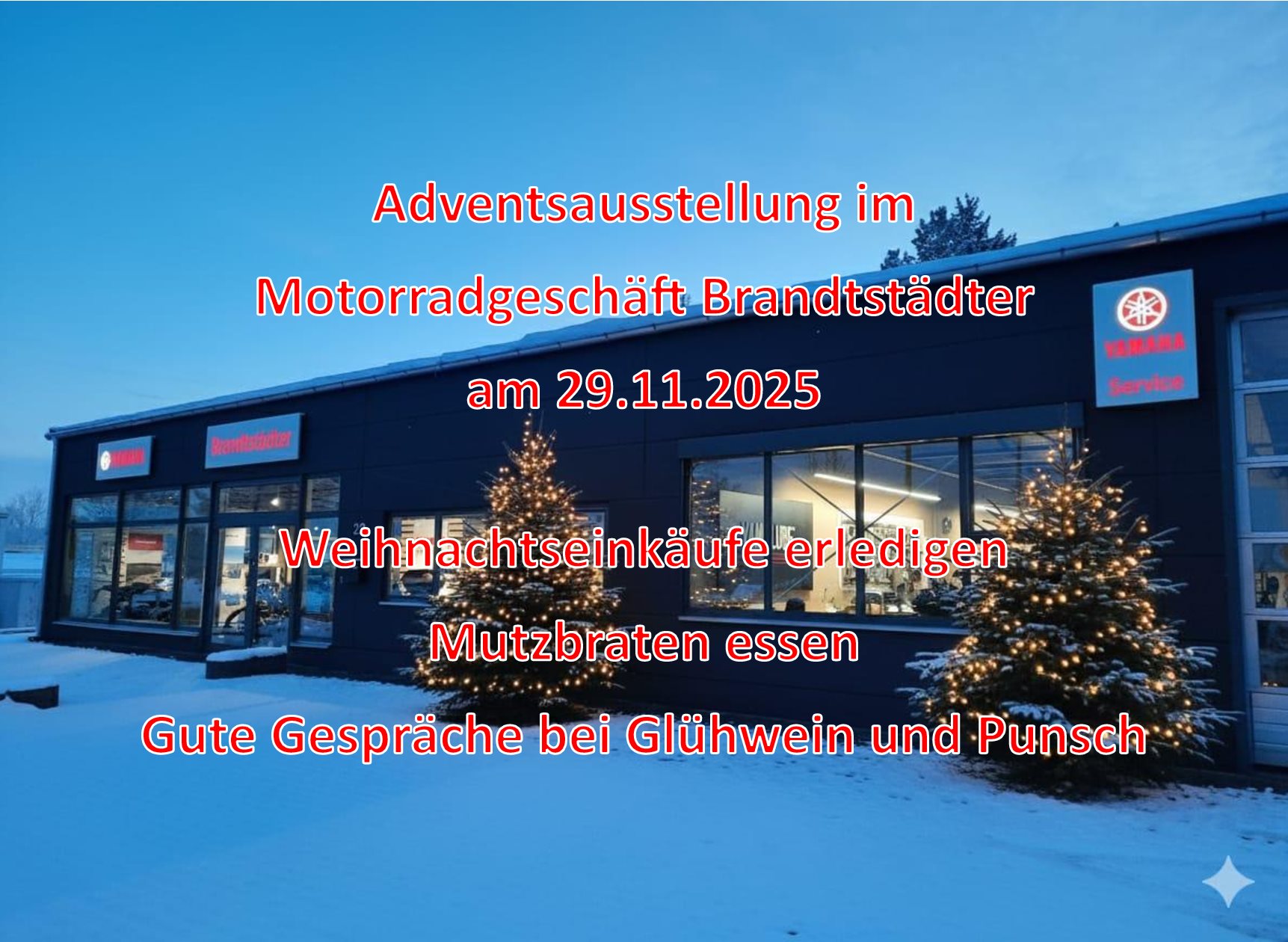 Adventsausstellung am 29.11.2025 von 9.00 - 17.00Uhr in unserem Motorradfachgeschäft. Gern besprechen wir mit euch eure Pläne für die nächste Motorradsaison und schenken dabei Glühwein und Pusch aus. Auf euren Weihnachtseinkauf geben wir 20 % Rabatt auf vorrätige YAMAHA-Bekleidung und Accessoires.
