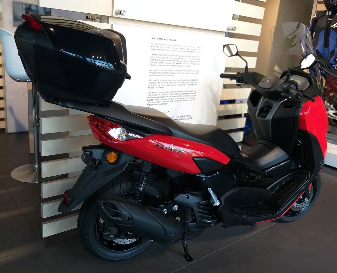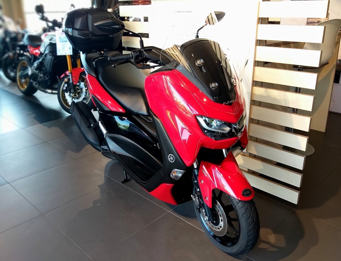 Yamaha NMAX 125 mit wenig km-Laufleistung und Topcase und hoher Scheibe.